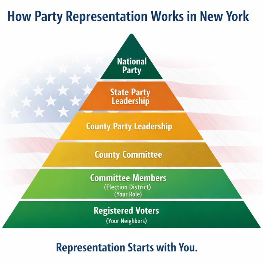 In New York, that local level is the Election District (ED). Each political party has its own County Committee Members who represent enrolled voters within their Election District and participate in the party’s internal governance.