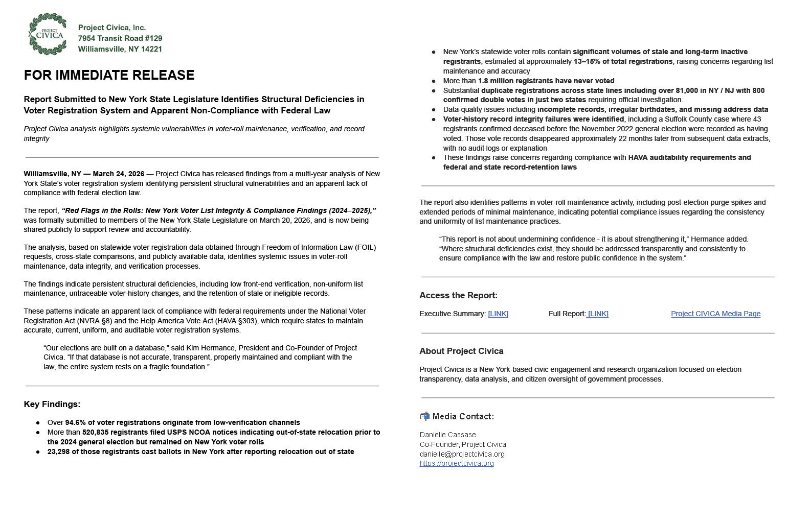 Project Civica has released findings from a multi-year analysis of New York State’s voter registration system, identifying structural deficiencies in voter-roll maintenance, data integrity, and verification processes. The report, formally submitted to members of the New York State Legislature on March 20, outlines patterns that indicate a lack of compliance with federal election law requirements and raise significant concerns regarding system accuracy and accountability.